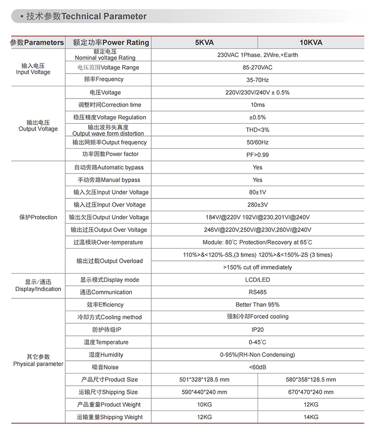 產(chǎn)品簡介: 輸入電壓范圍Input voltage range:85-270VAC,1Phase, 2Wire,+Earth輸入頻率Input frequency range:35-70HzFeatures:調(diào)整時間Correction time 10ms輸出精度Output accuracy +/-0.5%輸出波形失真度Output wave form distortion THD<3%功率因數(shù)Efect of Power factor PF>0.99頻率保護Frequency protection◆與發(fā)電機兼容