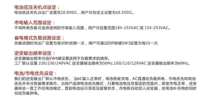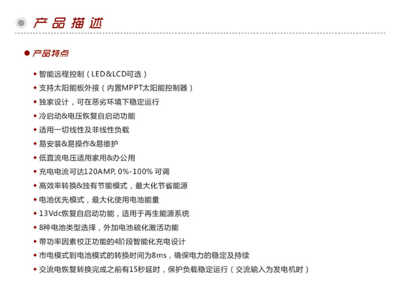 產(chǎn)品簡(jiǎn)介: 一元48VDC 380VAC三相儲(chǔ)能逆變器100%支持三相不平衡;可同時(shí)帶單相負(fù)載及三相負(fù)載,支持三相不平衡。過(guò)載能力可高達(dá)額定功率300%(持續(xù)20秒),內(nèi)置大電流充電器,充電電流0-100%可調(diào)。內(nèi)置過(guò)載、短路、過(guò)壓、欠壓、過(guò)溫等保護(hù)功能,市電模式到電池模式的轉(zhuǎn)換時(shí)間為8ms,確保電力的穩(wěn)定及持續(xù),根據(jù)負(fù)載類(lèi)型可選輸入市電壓范圍(318-438V或266-438V)。